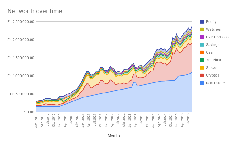 This is my current Net Worth Portfolio. The P2P Portfolio is mostly in EUR which gets converted in CHF at the daily rate. The stock portfolio is mostly in USD which also gets converted to CHF at the daily rate.